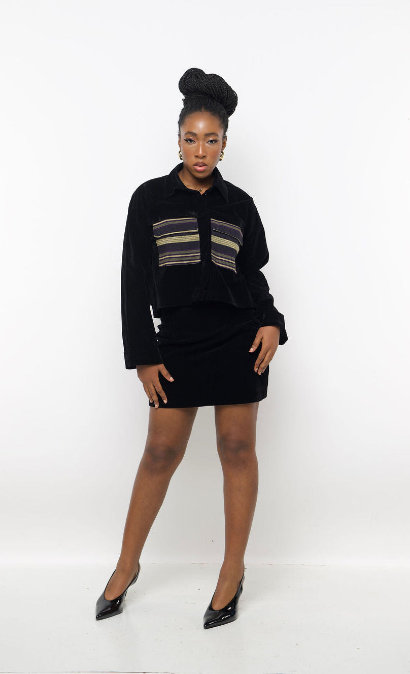 Command attention in effortless luxury with the Noir Luxe Velvet Set, a sophisticated pairing that fuses timeless minimalism with African-inspired artistry. This two-piece ensemble features a plush black velvet jacket adorned with intricate woven heritage stripe panels, paired with a sleek matching mini skirt for a modern, feminine silhouette.