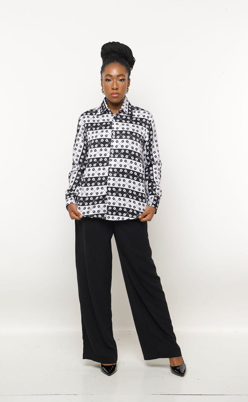 This classic long-sleeve shirt features a striking black-and-white cowrie shell pattern, symbolizing femininity, strength, and wealth across African traditions. Crafted from a lightweight, silky fabric with a polished finish, it drapes beautifully for a relaxed yet refined look.